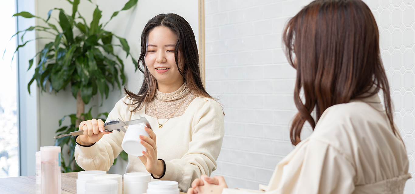 ドラッグストアやバラエティショップで販売する商品の開発を企画部と一緒にしており、主に商品の仕様、コストやスケジュール管理を担当しています。企画部の作りたい商品を実際に形にしていくためには、どうしたらいいかを考える部署です。まず、様々な容器のサンプルを取り寄せるところから始まり、その後、容器を入れるパッケージについても、お取引しているメーカー様と打ち合わせしながら決めていきます。
