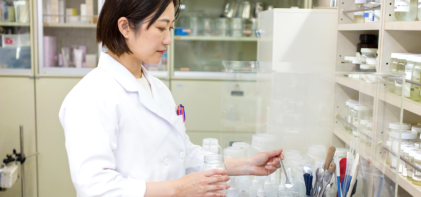 主な仕事は企画部のプランナーから「こういった使用感、外観の製品が欲しい」という依頼を受け、その要望を満たしたバルクの処方を設計することです。化粧品の原料には油剤や保湿剤など様々な物がありますが、配合する種類や量によって使用感や外観は大きく変わるため、各原料の特性を考慮しながら一つ一つ原料を選定して、目標とする使用感や性状を目指して、試作を繰り返します。また、製品の効果性や安全性も重要なため、機器を使った効果性評価試験やパッチテスト、モニター試験等を実施し、お客様に安心して使用していただけることを確認しながら開発を進めています。